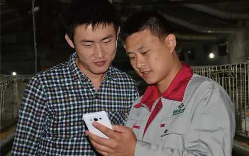 兩名養(yǎng)殖戶正在手機上操作新希望集團推出應用軟件(受訪者供圖)