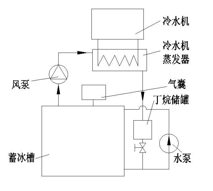 丁烷冰漿采用了簡單高效的理念,采用冷水機組、風(fēng)泵、水泵等通用高效設(shè)備,流程簡單,控制容易,維護(hù)方便,氣態(tài)丁烷通過風(fēng)泵加壓進(jìn)入冷水機蒸發(fā)器,通過氣液相變高效換熱冷凝,液態(tài)丁烷和水一起進(jìn)入水泵,再與水直接接觸再蒸發(fā)為氣態(tài)進(jìn)行高效熱交換,水放出相變熱變?yōu)楸ち枋奖?,可以泵送,冰漿流入蓄冰槽,氣態(tài)丁烷進(jìn)入風(fēng)泵不斷循環(huán);氣囊接通循環(huán)系統(tǒng),使系統(tǒng)既封閉又自動保持常壓(大氣壓力);冷水機蒸發(fā)器中丁烷溫度控制在20C左右(風(fēng)壓約10kpa);蓄冰槽中氣態(tài)丁烷蒸發(fā)溫度在-0.50C左右(氣壓約0kpa),蓄冰槽中冰水混合溫度在00C。丁烷冰漿技術(shù)綜合能效比可達(dá)4.0,尤其投資省,可低于常規(guī)冷水機組空調(diào)投資,而且省電費更多可達(dá)40-70%。丁烷冰漿缺點是丁烷易燃易爆,有安全性要求,由于是密閉系統(tǒng)、充填量小(僅約30g/kw)、強制通風(fēng)且系統(tǒng)壓力低(僅0-10kpa),丁烷不易泄露,采用安全防范措施,嚴(yán)格按安全規(guī)程操作,丁烷冰漿明顯比氨制冷系統(tǒng)風(fēng)險小,也比燃?xì)鉄崴?廚房煤氣風(fēng)險低。