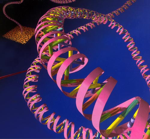1953年4月25日,世界權(quán)威雜志《自然》雜志發(fā)表了沃森、克里克的一篇900多字優(yōu)美精煉的短文,宣告了DNA分子雙螺旋結(jié)構(gòu)模型的誕生。這個(gè)結(jié)構(gòu)模型的要義是:DNA是一個(gè)長(zhǎng)長(zhǎng)的雙鏈分子,由兩條同軸反向相互纏繞的多核苷酸鏈組成,外側(cè)是由脫氧核糖和磷酸根組成的分子骨架,中間是由互補(bǔ)的堿基對(duì)組成的階梯,堿基配對(duì)方式是A配T,C配G;堿基對(duì)間距為0.34納米,每10個(gè)堿基對(duì)形成一個(gè)螺旋周期,螺旋直徑為1納米。這個(gè)模型既能從螺旋性、分子直徑、堿基對(duì)的幾何學(xué)尺度等方面闡明X射線衍射圖像,又能以堿基專一性互補(bǔ)配對(duì)來(lái)解釋查伽夫當(dāng)量定律。DNA雙螺旋結(jié)構(gòu)是一個(gè)極為成功、無(wú)懈可擊的DNA分子結(jié)構(gòu)模型,它由兩條右旋但反向的鏈在同一個(gè)軸上盤(pán)而成,像一個(gè)螺旋形的梯子,生命的遺傳密碼就列在梯子橫檔上。據(jù)科學(xué)家統(tǒng)計(jì),一個(gè)體細(xì)胞的全部DNA“螺旋樓梯”長(zhǎng)約2米。若將一個(gè)人的全部DNA連接起來(lái),可以在地球和太陽(yáng)之間扯上80個(gè)來(lái)回。 DNA分子雙螺旋結(jié)構(gòu)模型的發(fā)現(xiàn),是生物學(xué)史上的一座里程碑; 1962年,沃森、克里克因發(fā)現(xiàn)DNA分子結(jié)構(gòu),與改進(jìn)了X射線衍射技術(shù)的威爾金斯一起獲得了諾貝爾醫(yī)學(xué)或生理學(xué)獎(jiǎng)。