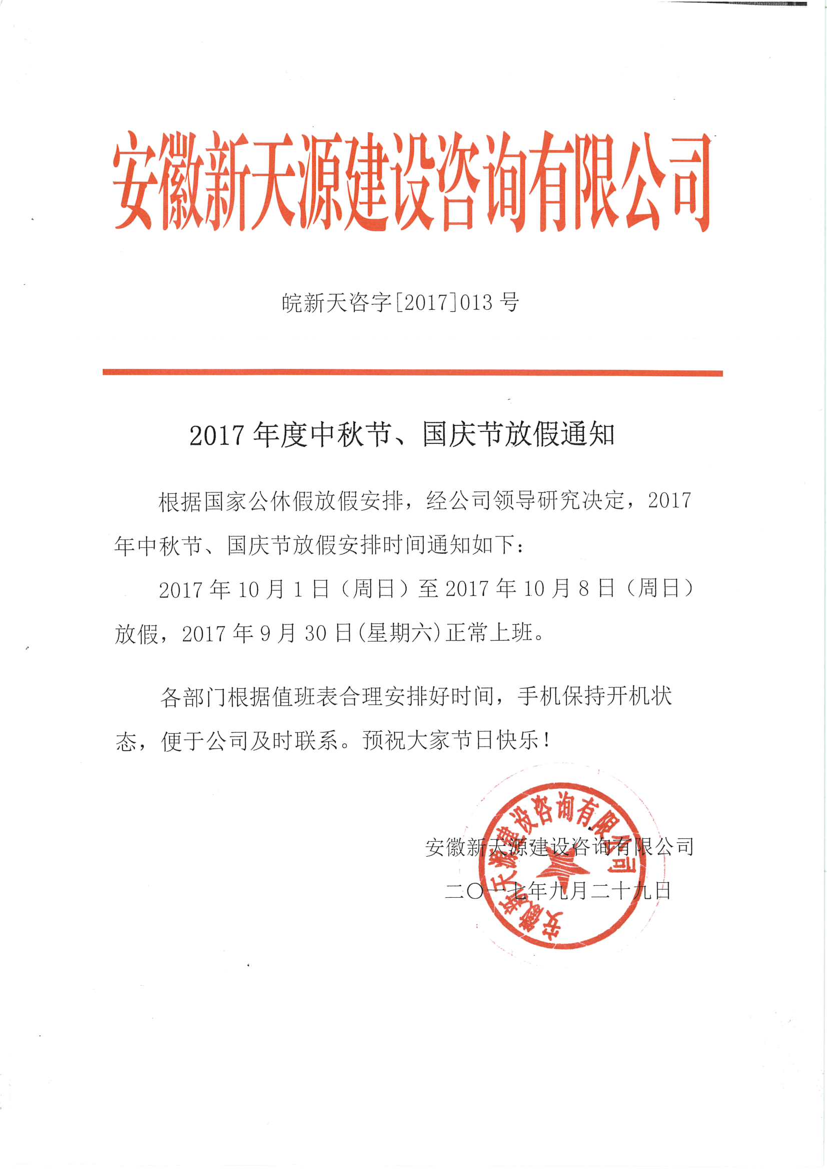 2017年度中秋節(jié)、國慶節(jié)放假通知