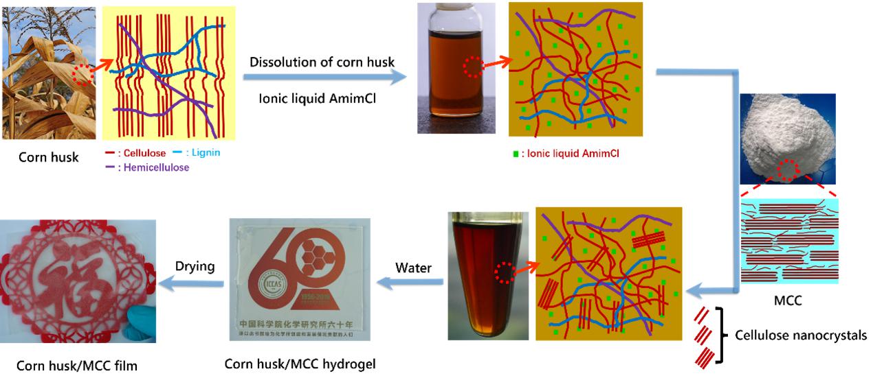 我們做出的兩類離子液體溶劑,可以在一個(gè)很溫和的條件下(一般不超過100℃)將纖維素溶解。過去一二十年有很多人做纖維素的離子液體體系,目前公認(rèn)最好的三種離子液體中有兩種是我們發(fā)明的,其中AmimCl可以溶解木材,被稱為溶解能力最強(qiáng)的溶劑。后來我們提出了它的溶解機(jī)理,我們認(rèn)為離子液體陰陽離子結(jié)構(gòu)和纖維素羥基的分別作用把里面原來氫鍵打開,像剪漁網(wǎng)似的,使它變成線性的分子才能溶解。