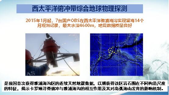 在2015年,我國在西太平洋雅浦海溝投放了7臺海底地震儀,留海觀測時間是14個月,最大的水深是4600米。記錄的地震波形都很好。主要用于揭示巖石圈在不同構(gòu)造尺度的特征,了解卡羅琳洋脊俯沖與雅浦海溝的相互作用及對島弧海山發(fā)育的影響機(jī)制。