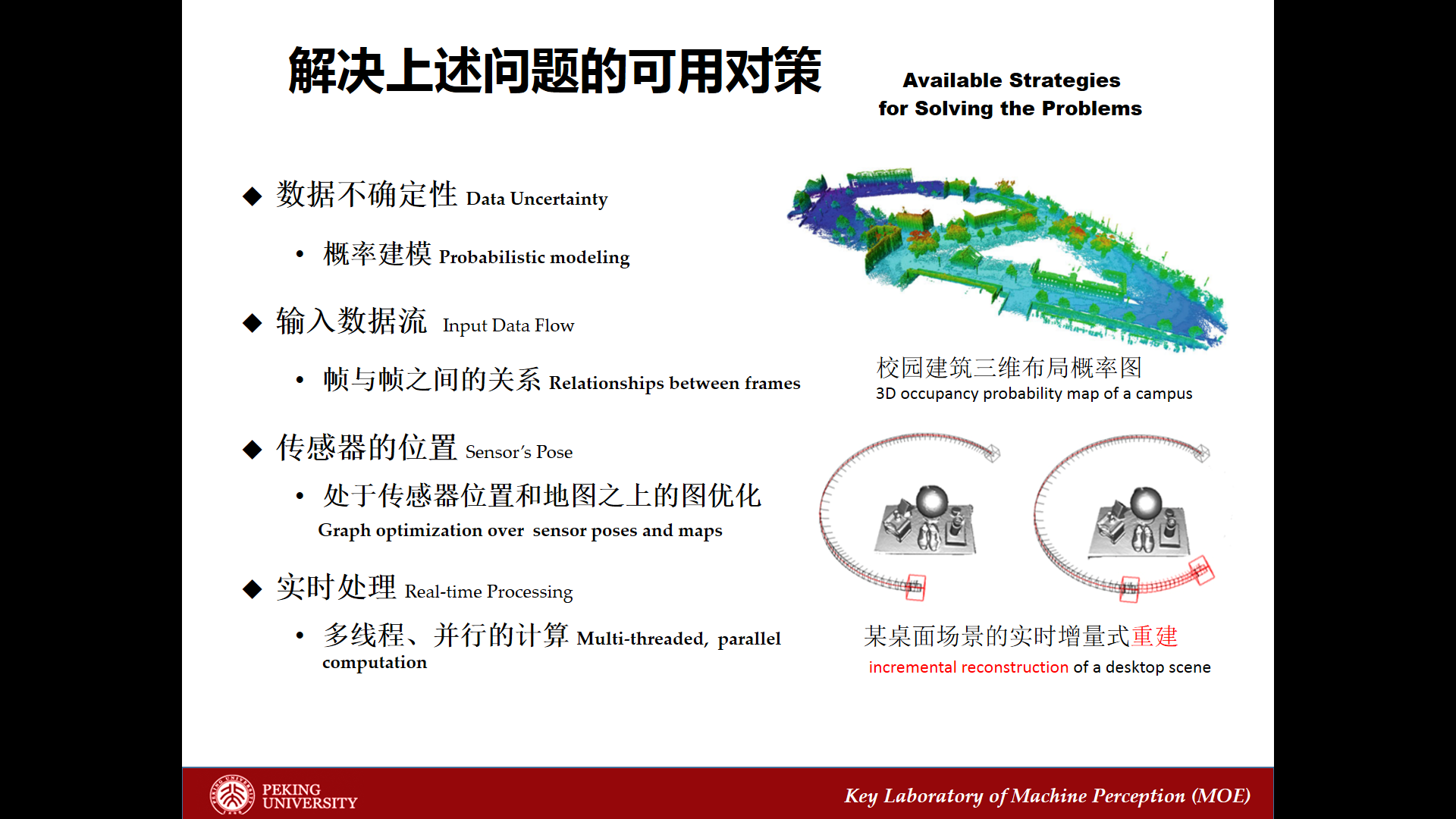 下面我再給大家具體說一下這些問題怎么解決。這里面解決了一些,從概念上非常容易想到的辦法,但是很多需要下一些功夫。數(shù)據(jù)的不確定性,我們可以用概率統(tǒng)計的方式,對數(shù)據(jù)進行建模。數(shù)據(jù)流怎么辦?能不能很好地利用數(shù)據(jù)之間的時間的一貫性,另外用傳感器的姿態(tài)做定位,像更好的一些優(yōu)化的東西,能不能幫助我們解決優(yōu)化的問題。像實時處理,我們其他一些更好的節(jié)省計算量的方法可能要開發(fā)出來。