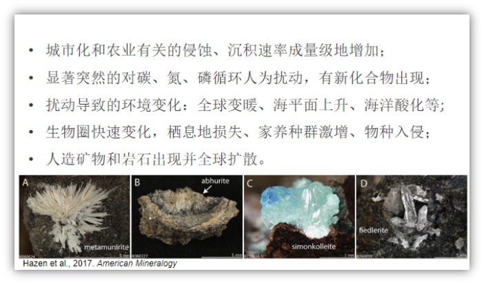 國(guó)際地層委員會(huì)的人類世工作組工作了10年,總結(jié)了一些現(xiàn)象,如城市化和農(nóng)業(yè)的侵蝕、沉積速率成量級(jí)地增加,顯著而突然的對(duì)碳、氮、磷循環(huán)的人為擾動(dòng),產(chǎn)生一些新的化合物,使得生物圈出現(xiàn)快速變化、棲息地的損失帶來(lái)植物多樣性的降低、馴化生物種群大規(guī)模增加,人類的遷徙活動(dòng)等等。