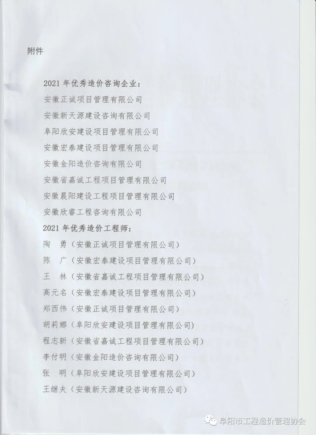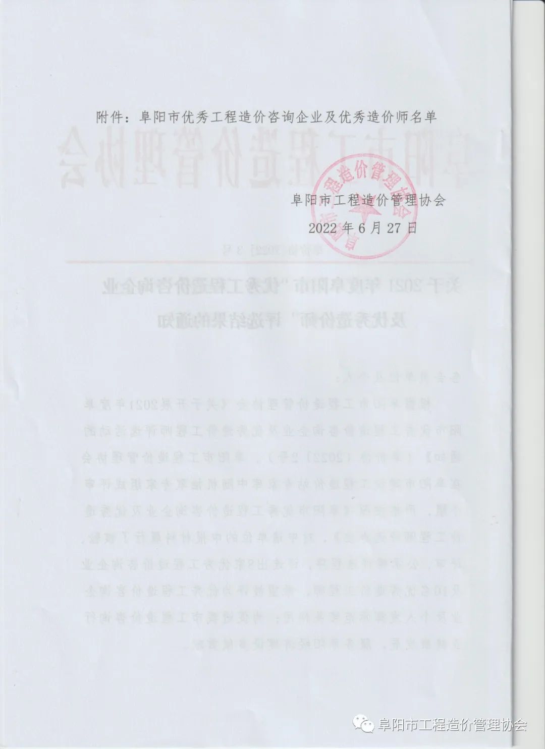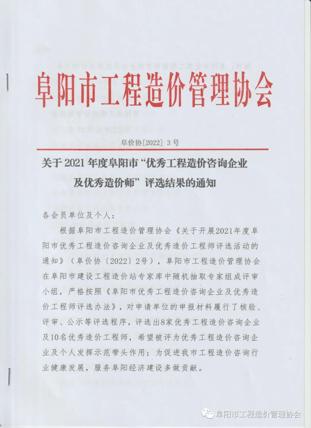 關(guān)于2021年度阜陽(yáng)市“優(yōu)秀工程造價(jià)咨詢企業(yè)及優(yōu)秀造價(jià)師”評(píng)選結(jié)果的通知